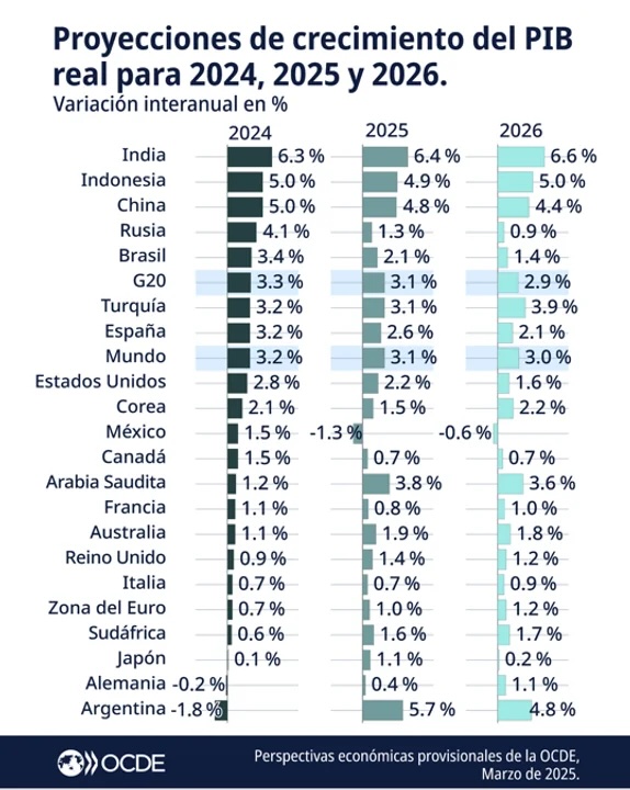 El informe de la Ocde también anticipa que el crecimiento global se moderará, con un avance del 3,1% en 2025 y del 3% en 2026, debido a barreras comerciales y la incertidumbre política en varias economías del G20.