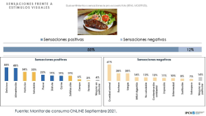 Lo interesante es que cuando la gente está enfrente de una foto de un plato de comida con presencia de carne, la preponderancia de emociones positivas es aún más alta. Las emociones positivas se encuentran en un 88 % de las respuestas y están relacionadas con satisfacción sensorial que aporta el producto. También con la alimentación, la nutrición y el impacto favorable en la salud.