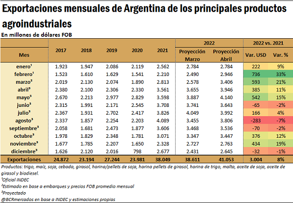 Por último, considerando que las importaciones temporarias de soja se proyectan en 1.340 mill/dol, las exportaciones netas del sector alcanzarían US$ 39.714 millones, unos US$ 4.285 millones más que lo alcanzado en el 2021.