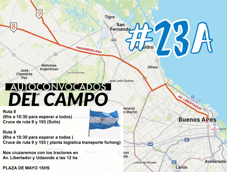 El reclamo, comandado por varias agrupaciones de autoconvocados y sin respaldo de las entidades rurales nacionales, se realizará el sábado 23 de abril en la Ciudad Autónoma de Buenos Aires y el objetivo es poder llegar a las 15 a estacionar los vehículos en la Plaza de Mayo, frente a la Casa Rosada.