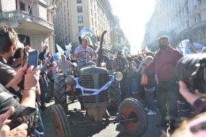 BUENOS AIRES (NAP). Unas 100 mil personas especialmente productores agropecuarios marcharon este sábado en camionetas y tractores hasta la Plaza de Mayo, para rechazar la fuerte presión tributaria que afecta a la actividad, a la que se sumaría un nuevo impuesto por la presunta “renta inesperada” que estarían percibiendo por la suba de los precios de los granos.