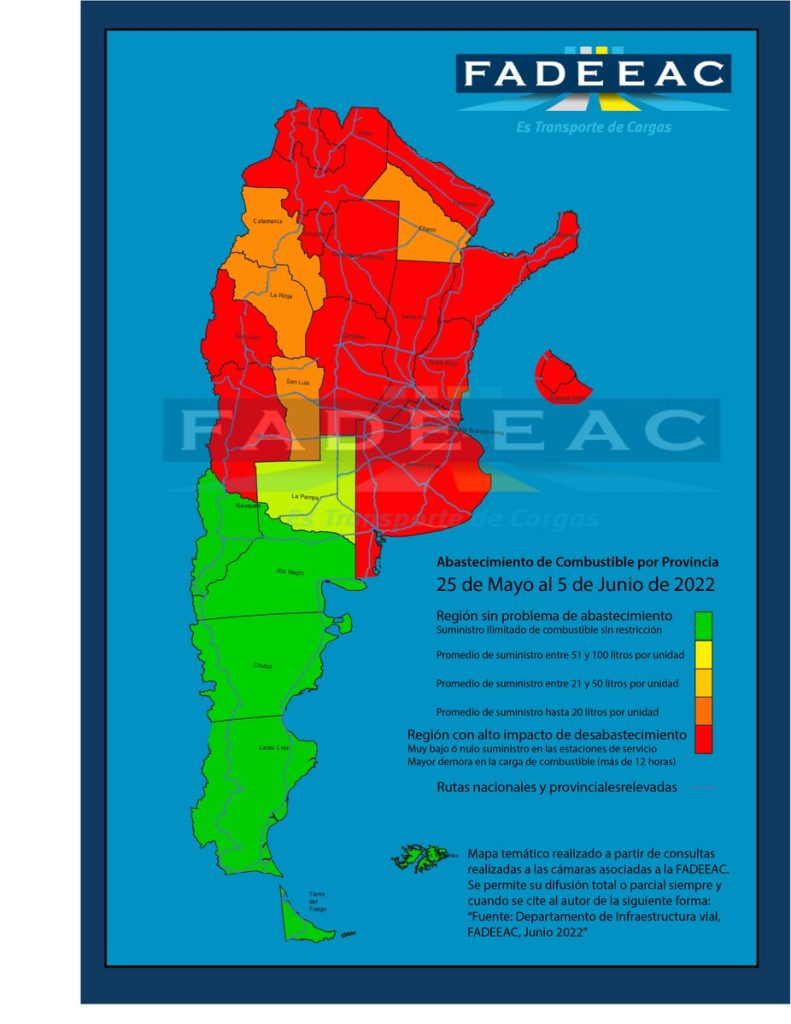 BUENOS AIRES (NAP). La Federación Argentina de Entidades Empresarias del Autotransporte de Cargas, que reúne a las empresas transportistas del país, actualizó su Mapa de abastecimiento de gasoil y afirmó que “excepto las provincias hidrocarburíferas de la Patagonia, el resto de los distritos tiene dificultades para acceder a combustible, un insumo imprescindible para desarrollar nuestra actividad”.