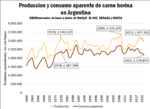 Desde 1975 hasta la actualidad la producción cárnica bovina se mantuvo en un rango relativamente estable que va de las 2,5 a los 3 millones de toneladas de carne bovina, con contadas excepciones. De hecho, el 2021 no fue la excepción, contabilizando una producción de algo menos de 3 Mt (equivalente res con hueso), por debajo de los 3,2 Mt del 2020 y cortando así con una racha de 3 años consecutivos donde se había superado el límite superior del rango de 3 Mt.