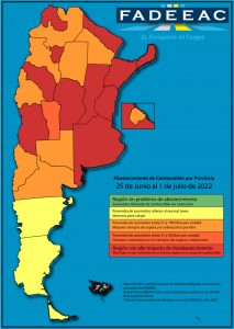 La última publicación del “Mapa de abastecimiento de gasoil” que hizo este martes la Federación Argentina de Entidades Empresarias del Autotransporte de Cargas y que marca con tres colores según la magnitud del problema (rojo, anaranjado y amarillo) o con verde si no hay problema, se quedó sin el verde. “Esperamos que este haya sido el mapa más complicado de la serie”, planteó la Fadeeac.