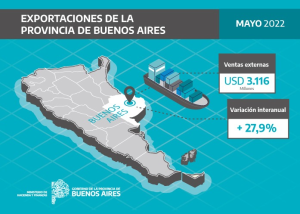 BUENOS AIRES (NAP) Las exportaciones bonaerenses totalizaron en mayo último los U$S3.116 millones, comprado con igual mes de 2021, el mejor registro para este mes desde 2010, en el comienzo de la serie.