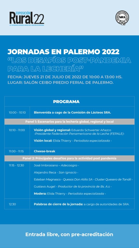 Desde las 10 y hasta las 13 es el horario de la jornada “Los desafíos pospandemia para la lechería” convocada por la Comisión de Lechería de la Sociedad Rural Argentina (el programa en el primer flyer).