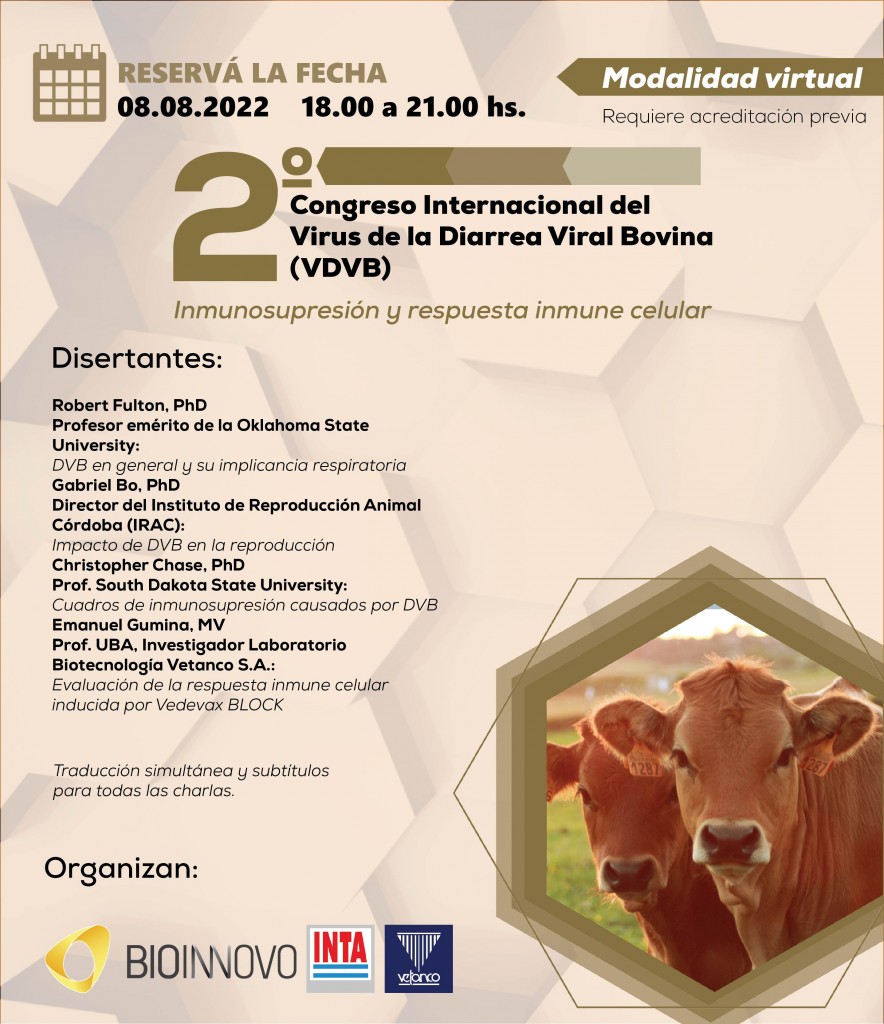 BUENOS AIRES (NAP). Bioinnovo, la empresa público-privada formada por Vetanco y el INTA, organiza el Segundo Congreso Internacional del DVB, a realizarse de forma virtual el día lunes 8 de agosto de 18 a 21.