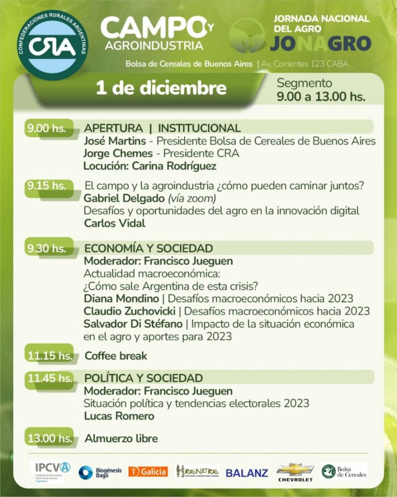 BUENOS AIRES (NAP). Confederaciones Rurales Argentinas convoca a la 6ta sexta edición de la Jornada Nacional Agropecuria que se realizará en la sede de la Bolsa de Cereales de Buenos Aires, ubicada en Av. Corrientes 123, el próximo jueves 1 de diciembre.