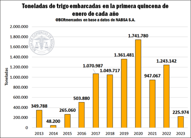 Así, si se compara lo sucedido durante la primera quincena de enero en años anteriores, hay que retornar  a 2014 para encontrar un volumen embarcado inferior al actual, consolidando el peor mes de enero para el trigo en los últimos 9 año.
