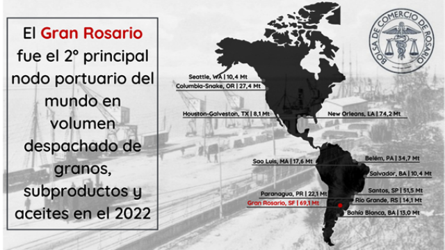 Con los embarques del Gran Rosario en 2022, Argentina se colocó en el tercer lugar superando al resto del mundo en volumen despachado. Debido a esto último, el análisis siguiente se enfoca únicamente sobre los puertos de Estados Unidos, Brasil y Argentina, sin entrar en detalle de los puertos de los países de menor exportación total de granos y derivados que la región del Gran Rosario, como Ucrania, Rusia o Australia.