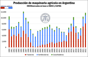 (NAP) Con casi 12.000 unidades producidas a nivel nacional (entre tractores, sembradoras y cosechadoras), la producción de este sector fue la más alta desde 1996, superando el volumen alcanzado en 2021, que hasta ahora ostentaba el mejor registro del presente milenio.