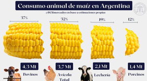 Alrededor de un tercio de este consumo correspondería al sector de producción de carne vacuna, otro tercio al sector avícola, un 19% consumiría la lechería y un 12% el sector porcino, consigno la Bolsa de Comercio de Rosario (BCR).