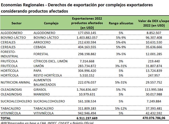 Se estima que en 2022 las Economías Regionales realizaron exportaciones por US $10.067 millones y una detracción por retenciones por un monto de US $ 470 millones.