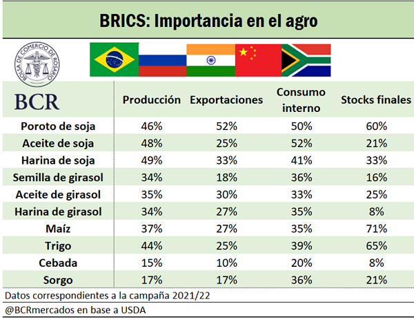 El trabajo resalta también el posicionamiento agroalimentario de los países del bloque: China e India como principales productores y consumidores globales de trigo, Rusia como su principal exportador. Brasil como principal exportador mundial de maíz y soja. China y Rusia como principales consumidores mundiales de cebada.