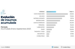 Aunque también aumentaron, Combustibles (2,4%), Lubricantes (3,65%) y Neumáticos (2,25%), arrojaron menores variaciones mensuales que el mes anterior. Costo Financiero, por su parte, tuvo un incremento de 23,6%, y Patentes y tasas, y Peaje fueron los dos ítems que no sufrieron modificaciones respecto de agosto.