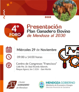 (NAP) El próximo 29 de noviembre se realizará en Mendoza el 4º Foro Plan Ganadero Bobino de Mendoza al 2030, que se llevará a cabo en el Centro de Congresos Francisco, Parque Agnesi, departamento de General San Martín, con entrada gratuita, previa inscripción.