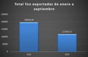 Mientras que el acumulado enero y septiembre 2023 fue de 117.429,72, en el mismo período 2022 la cifra alcanzó a 196829,96 tn.