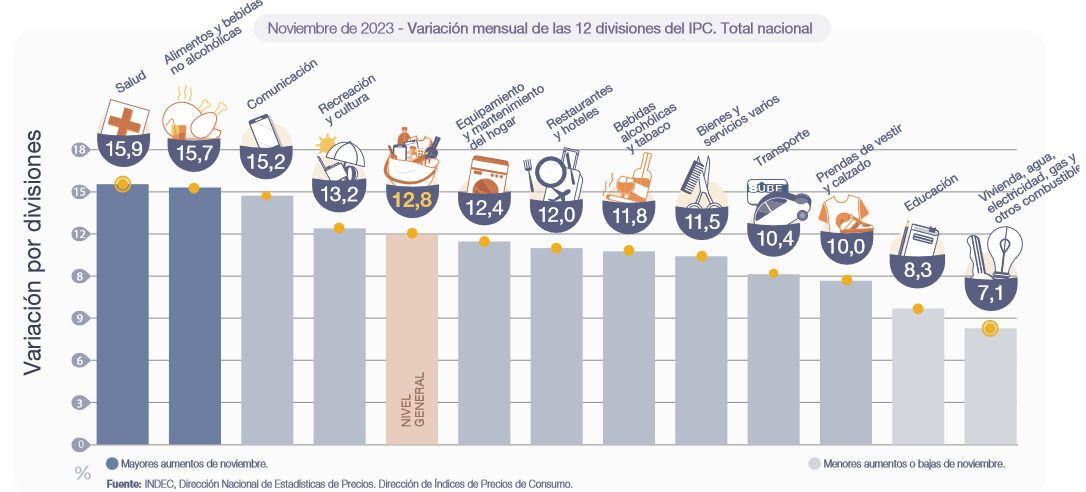 La suba de precios fue de 12,8% frente a 8,3% registrado en octubre. Según el Indec Alimentos y Bebidas, y Salud con mas de 15% fueron los de mayores ajustes.