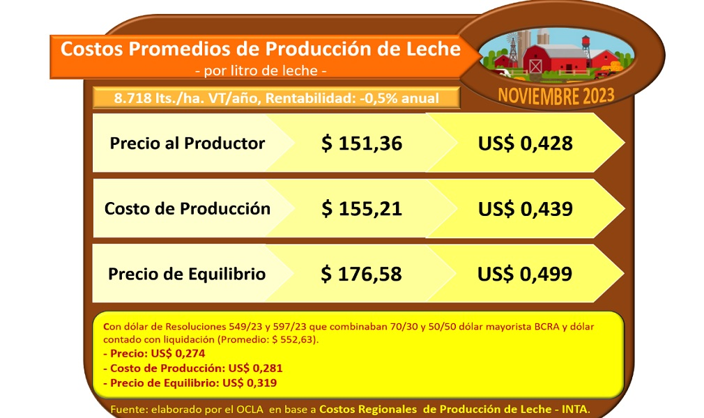 (NAP) Tras la devaluación del peso producida en noviembre, frente al dólar, el precio de la leche en tranquera tampoco alcanzó a cubrir los costos de producción de acuerdo a datos oficiales del Observatorio de la Cadena Láctea organismo que funciona dentro del organigrama de la Secretaría de Bioeconomía.