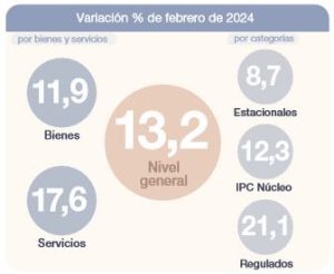 A su vez, los sectores que registraron las menores variaciones en febrero fueron Recreación y cultura (8,6%) y Prendas de vestir y calzado (7,2%). A nivel de las categorías, Regulados (21,1%) lideró el aumento seguida por el IPC Núcleo (12,3%), mientras que Estacionales registró un incremento de 8,7%.