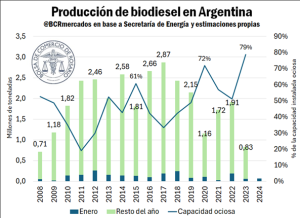 En consecuencia, la cayó un 56% en 2023 respecto al 2022. El nivel productivo tocó mínimos del año 2008, cuando la capacidad de la industria era un 62% menor a lo que es actualmente. Asimismo, la capacidad ociosa del biodiesel argentino se acercó al 80%.