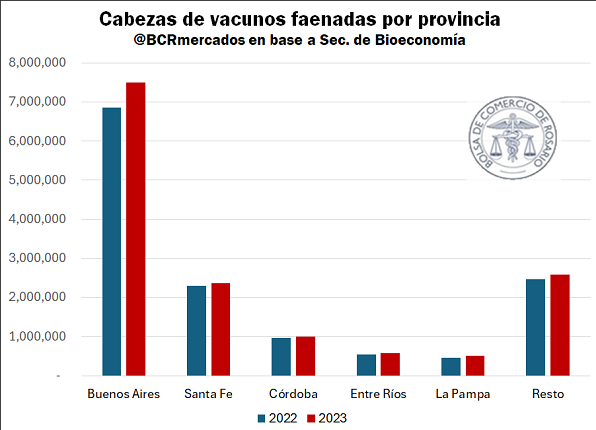 Su participación suele oscilar entre el 16% y el 18%. En 2023, en los establecimientos productivos de la provincia litoraleña se faenaron 2,4 millones de cabezas, dando cuenta del 16,3% del total nacional.