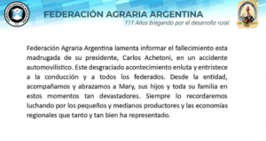 “Federación Agraria Argentina lamenta informar el fallecimiento esta madrugada de su presidente, Carlos Achetoni, en un accidente automovilístico. Este desgraciado acontecimiento enluta y entristece a la conducción y a todos los federados”, contaron en un comunicado que publicaron en sus redes sociales.