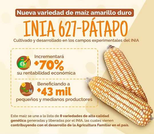 Según informó el Inia, el híbrido Inia 627 Pátapo permitirá incrementar en 72 % el rendimiento productivo del maíz, dado su alto potencial de rendimiento comercial: entre 11,52 a 14,20 toneladas por hectárea (t/ha). Y se calcula que podría ser sembrado por más de 43.000 pequeños y medianos productores.
