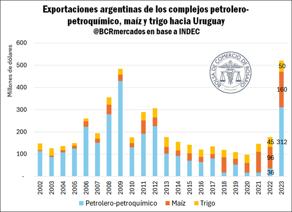 Pesar de la histórica sequía y su impacto en las exportaciones en 2023, Argentina tuvo de protagonistas al maíz y al complejo petrolero-petroquímico para apuntalar una suba exportadora del 24% el año pasado, siendo estos dos de los complejos que han mostrado mayor dinamismo en el comercio argentino-uruguayo.