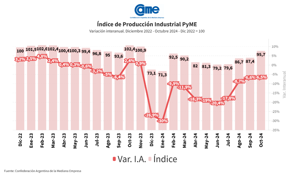 (NAP) La actividad industrial de las pymes descendió 6,5% interanual en octubre. Sin embargo, en la comparación mensual se registró un crecimiento del 4% en la medición desestacionalizada, alcanzando el nivel más alto de producción de los últimos once meses.