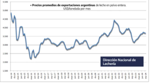 El precio FOB promedio de exportación de la leche en polvo entera argentina se ha venido recuperando en el último año y, si bien está lejos del nivel registrado a mediados de 2022, se encuentra en valores elevados en términos históricos.