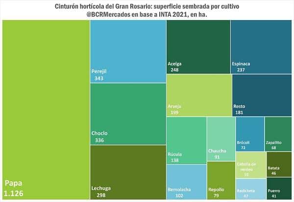 La BCR tomó datos de un censo realizado por el Instituto Nacional de Tecnología Agropecuaria y la Cátedra de Horticultura de la Facultad de Ciencias Agrarias de la Universidad Nacional de Rosario, que determinó que en 2021 el área hostícola ocupaba 2% de la superficie nacional.