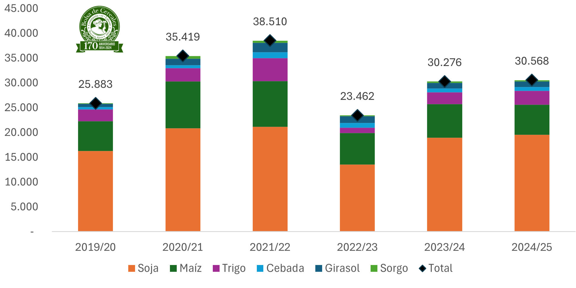 En cuanto a la recaudación fiscal, se espera que los derechos de exportación generen ingresos equivalentes a 7.370 mill/dol en la campaña 2024/2025, lo que representa una mejora interanual de 2%.