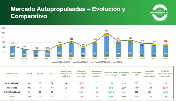 Por tipo de maquinaria, las pulverizadoras lideraron el crecimiento en diciembre con un aumento interanual del 112%, al registrarse 53 unidades frente a las 25 de diciembre de 2023.