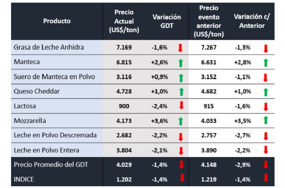 El precio promedio de todos los productos comercializados en esta primera subasta del GDT bajó 1,4%, en tanto que el volumen comercializado cayó 6,1%.
