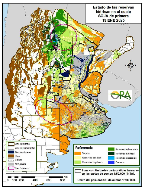 Los mapas corresponden a la estimación de contenido de agua en el primer metro de suelo, considerando una cobertura de SOJA de primera. Valores de reservas para localidades específicas (superficiales y profundas) se pueden consultar en la página web http://www.ora.gob.ar/camp_actual_cultivos.php.