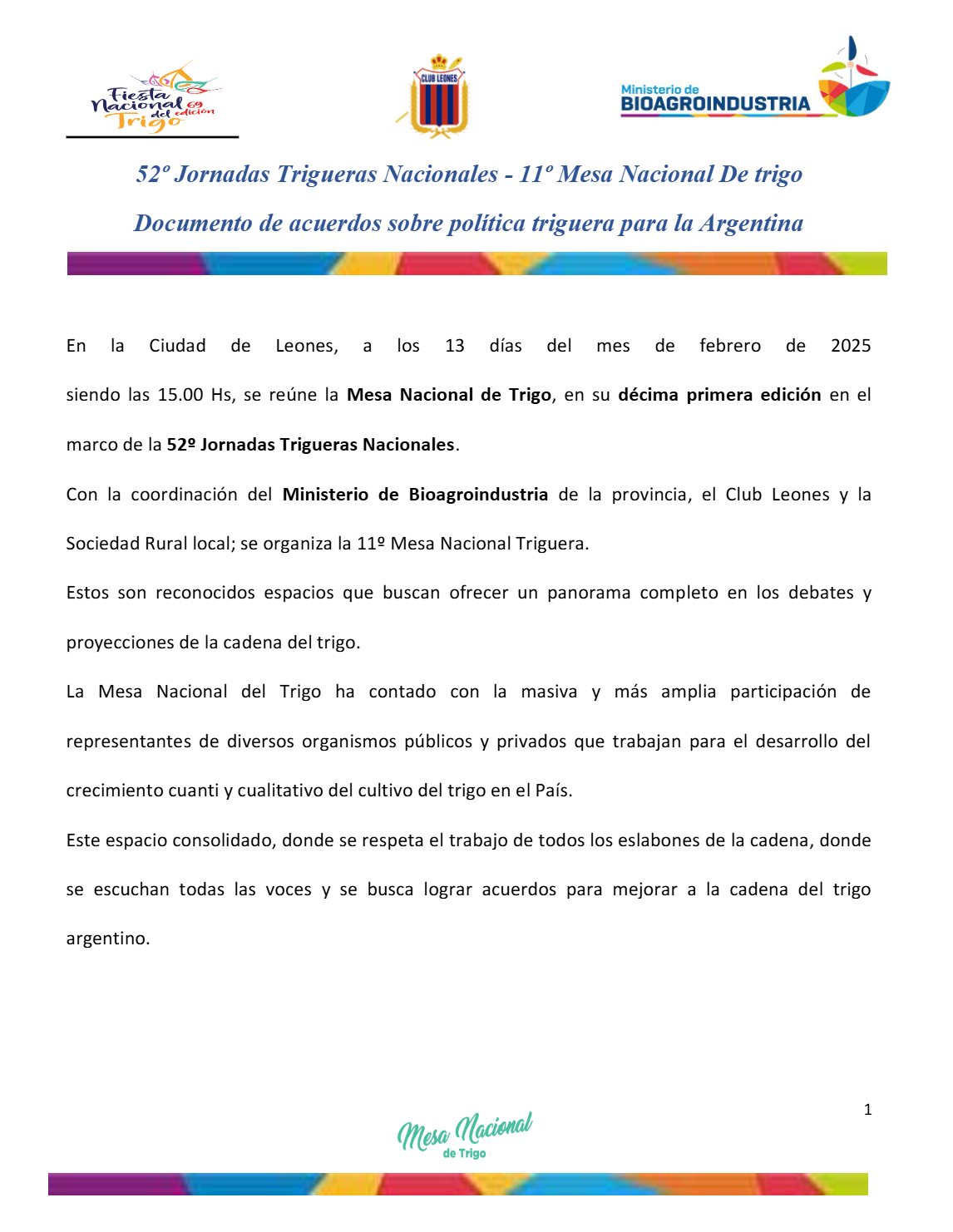 (NAP) La 11ª Mesa Nacional del Trigo, celebrada en Leones, Córdoba, en el marco de la 69ª Fiesta Nacional del Trigo, dejó en claro que toda la cadena triguera exige la eliminación total y permanente de las retenciones.