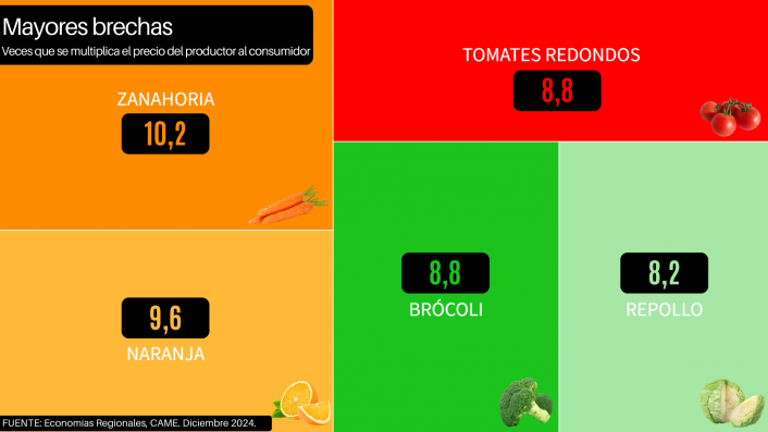 La zanahoria (12,6 veces), la naranja (9,8), la manzana roja (6,9), la pera (6,9) y el zapallito (6,6 veces) fueron los cinco productos que presentaron mayor diferencia entre los precios de origen y destino.