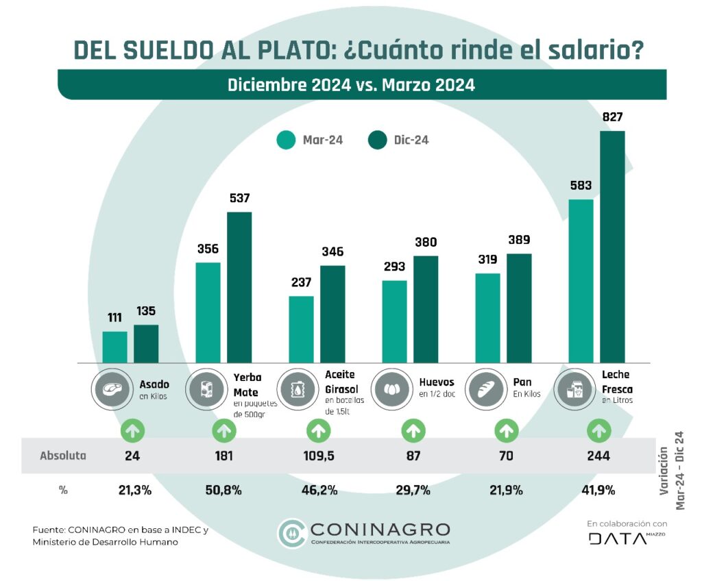El informe de Coninagro destaca que, entre marzo y diciembre de 2024, el poder adquisitivo mostró una mejora significativa frente a productos esenciales de la canasta básica como aceite de girasol, yerba mate, leche, asado, huevo y pan. “Estos valores benefician al consumidor, pero pueden afectar a nuestras cooperativas productoras de alimentos debido al atraso relativo de los precios”, señaló Lucas Magnano, presidente de la entidad.