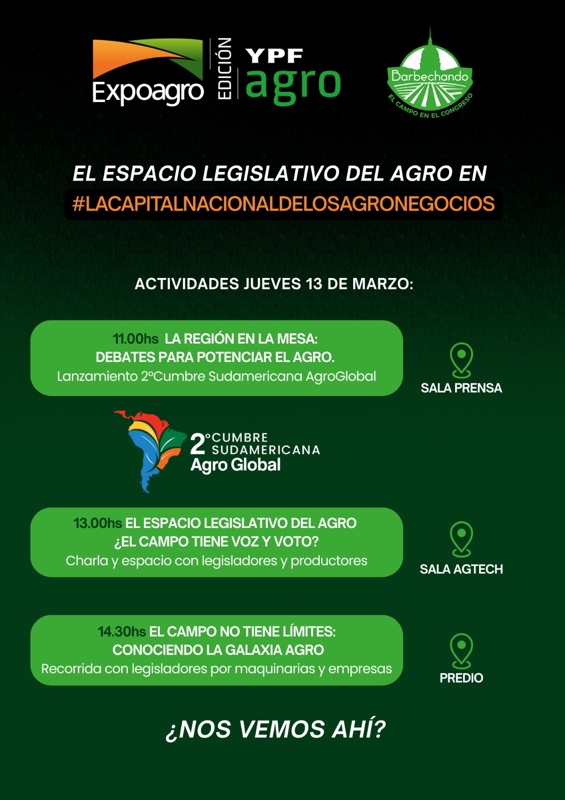 El lanzamiento oficial de la Cumbre se llevará a cabo el jueves 13 de marzo en la Sala de Prensa de Expoagro, donde se darán a conocer los detalles del evento. La presentación estará a cargo de Ángeles Naveyra, presidenta de la Fundación Barbechando, junto con Atilio Benedetti, presidente de la Comisión de Agricultura de la Cámara de Diputados, y Nicolás Mayoraz, diputado nacional por La Libertad Avanza.