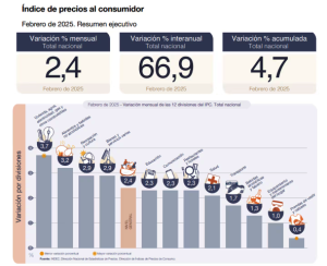(NAP) La inflación de febrero fue de 2,4% y acumuló de 66,9% en los últimos 12 meses, informó este viernes el INDEC. La variación mensual mostró una aceleración de 0,2 puntos porcentuales contra enero. El número acumulado en 2025, en tanto, es del 4,7%.