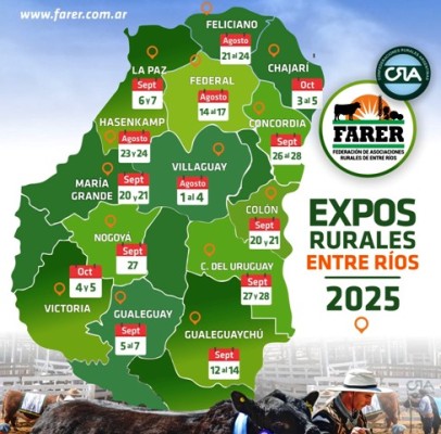 Nuevamente en 2025 las sociedades rurales entrerrianas tendrán el enorme desafío de organizar las exposiciones anuales, eventos que destacan año a año la labor de miles de productores agropecuarios a lo largo y a lo ancho de la provincia.