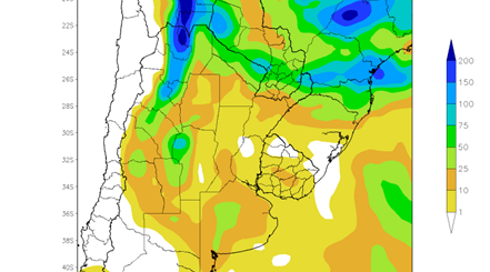  El extremo nordeste del NOA, el norte de la Región del Chaco, gran parte del Paraguay, el norte de la Mesopotamia, y el extremo norte del Uruguay observarán precipitaciones moderadas a abundantes (10 a más de 50 mm), con posibles focos de tormentas.