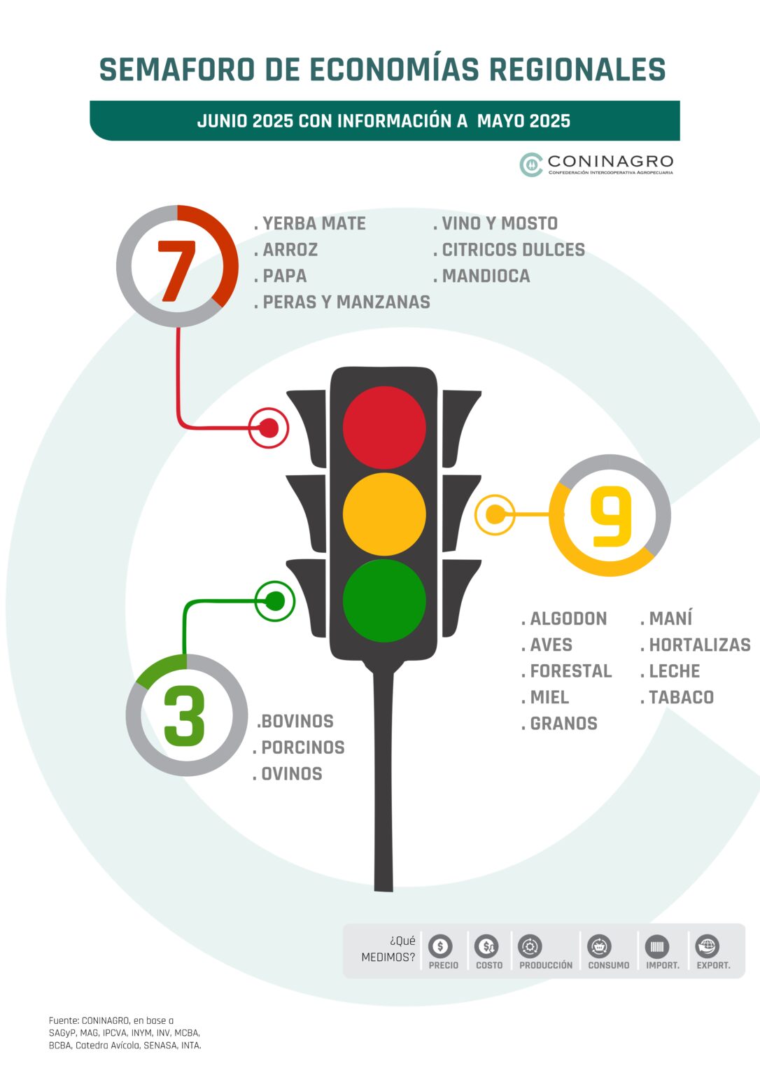 El Semáforo correspondiente al análisis de junio de 2025 apuntó que de las 19 actividades relevadas, solo tres —bovinos, porcinos y ovinos— lograron ubicarse en la zona verde, mostrando mejoras en los tres componentes evaluados: negocio (precios y costos), producción (superficie o stock y volumen) y mercado (exportaciones, importaciones y consumo).