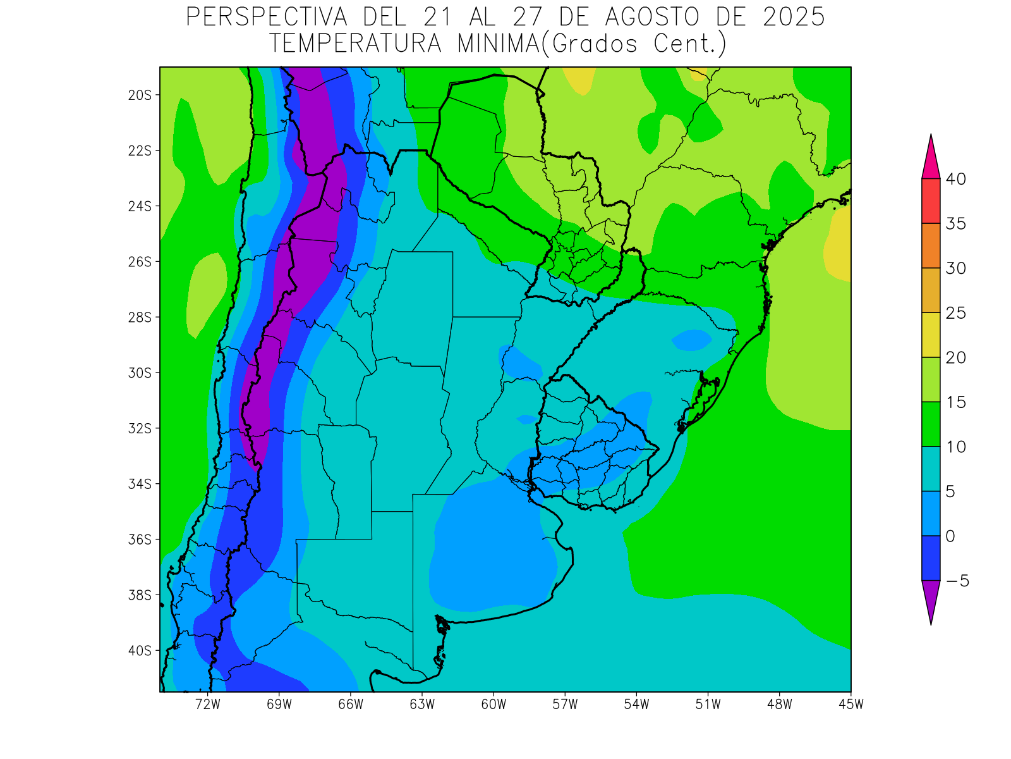  El este del NOA, la mayor parte de la Región del Chaco, el extremo sudeste del Paraguay, la mayor parte de la Mesopotamia, el este de Cuyo, el norte de Córdoba, el oeste de la Región Pampeana y el noroeste del Uruguay, observarán temperaturas mínimas entre 5 y 10 °C, con leve riesgo de heladas localizadas.