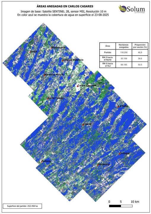 Los partidos más comprometidos son 9 de Julio (118.929 ha), Bolívar (100.123 ha) y Carlos Casares (100.057 ha), aunque también se reportan problemas en Pehuajó, Hipólito Yrigoyen, Lincoln, Viamonte y 25 de Mayo.