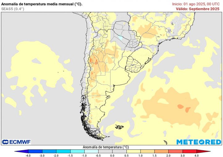El otro dato clave de septiembre será la temperatura. “Prácticamente todo el país presentará registros por encima de los valores normales, de norte a sur”, indicó De Benedictis en un informe de Agritotal.