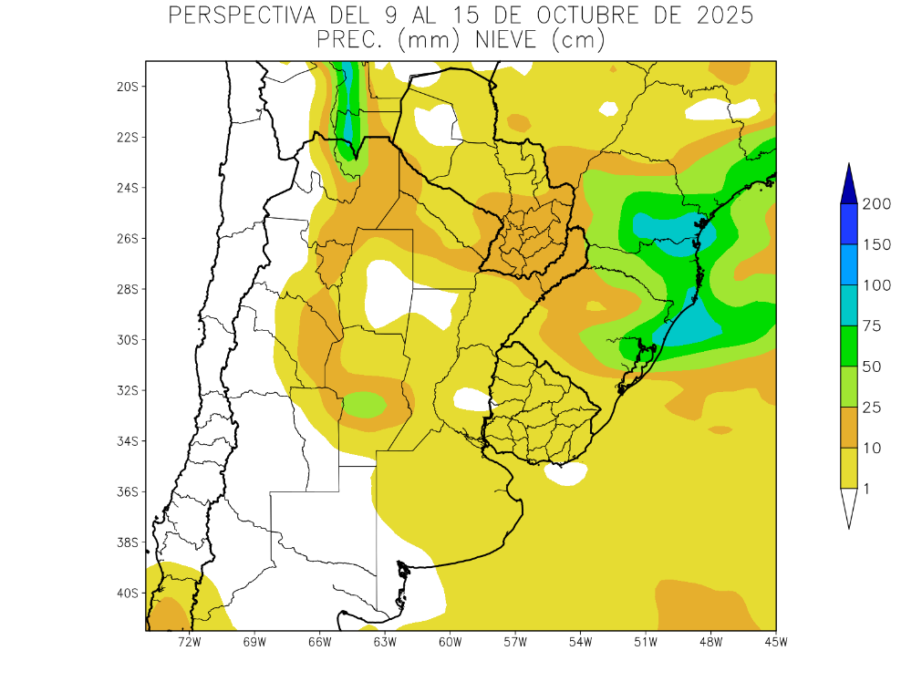 Hacia mediados de la perspectiva, se producirá el paso de un frente con actividad muy diferencial, produciendo precipitaciones de variada intensidad, con registros moderados a abundantes sobre el norte y el centro-este de La Argentina y la mayor parte del Uruguay, pero dejando a la mayor parte del Paraguay y a la mayor parte del oeste y todo el sur de La Argentina con aportes escasos a nulos, mientras la Cordillera Sur observará algunas tormentas tardías.