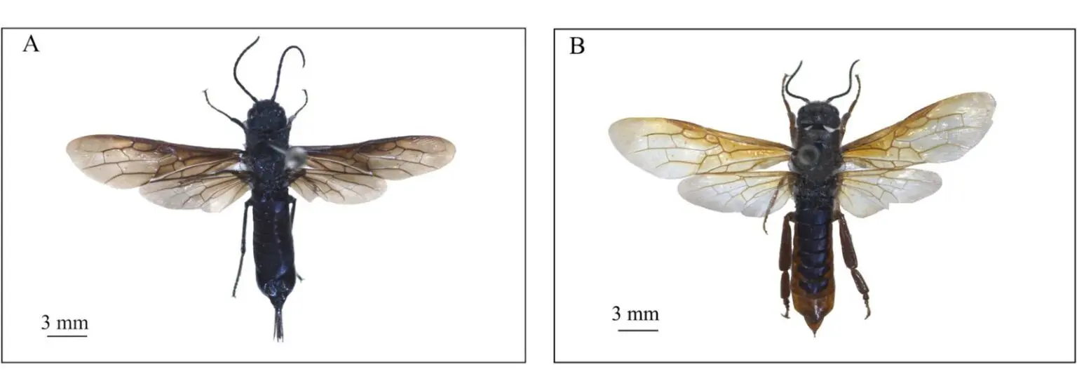 Hembras de Sirex obesus: cuerpo negro con reflejos azul metálico y patas traseras oscuras. Machos: abdomen anaranjado con una mancha dorsal oscura.
