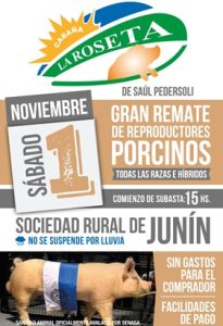 (NAP) El próximo sábado 1 de noviembre se llevará a cabo un Gran Remate de Reproductores Porcinos en la Sociedad Rural de Junín, organizado por la Cabaña La Roseta de Saúl Pedersoli.
